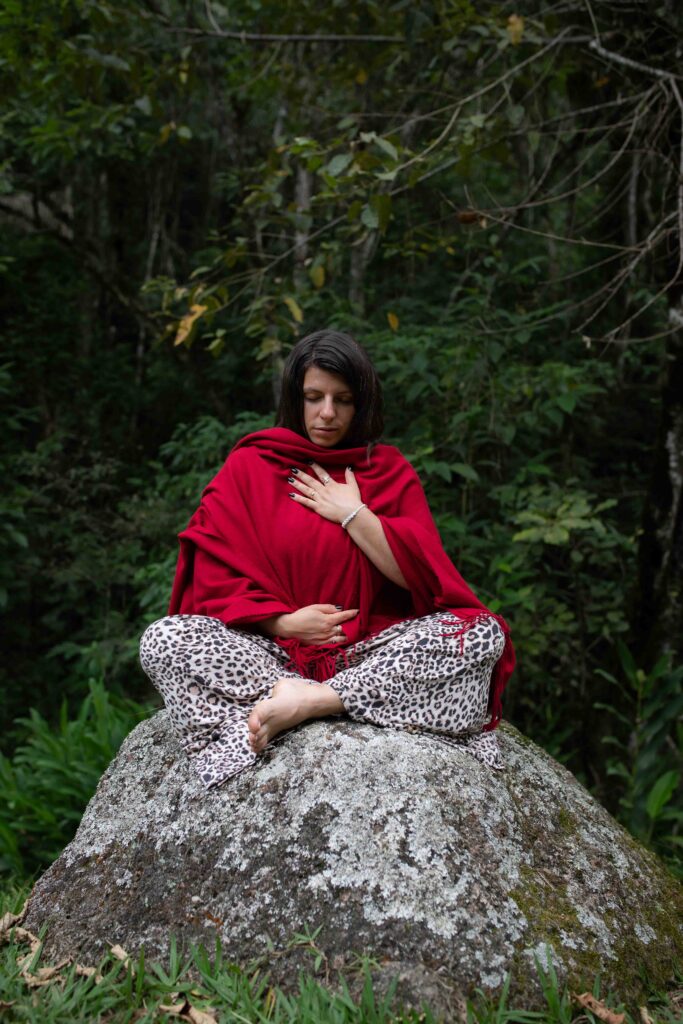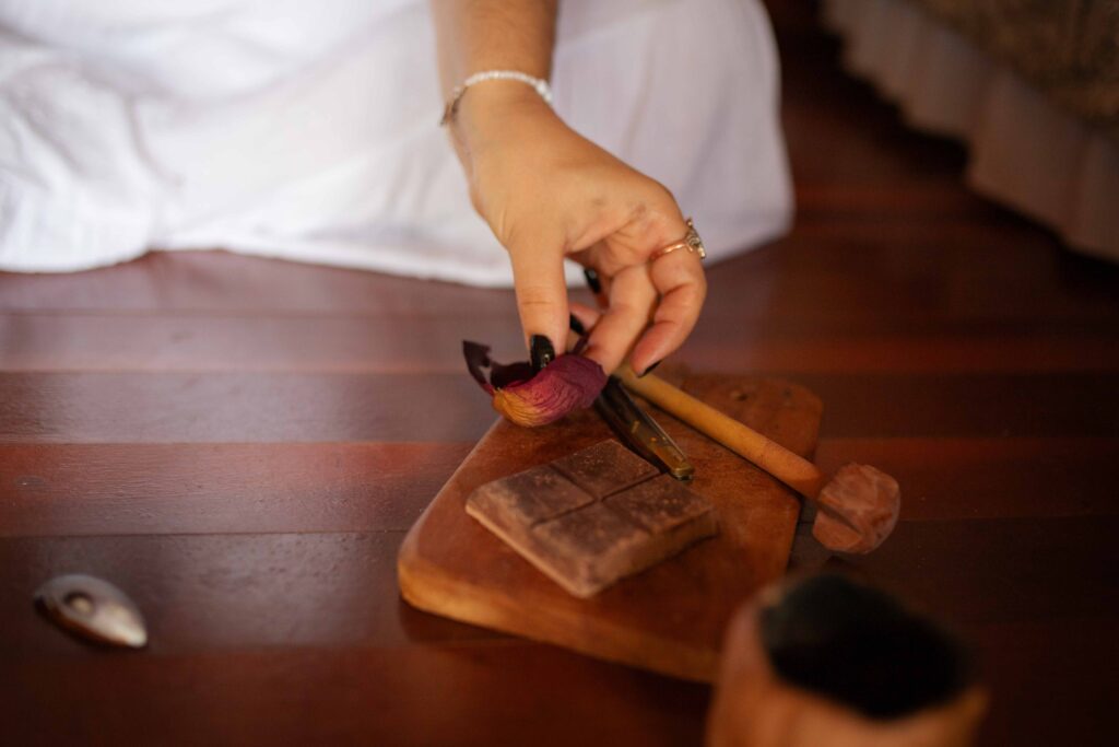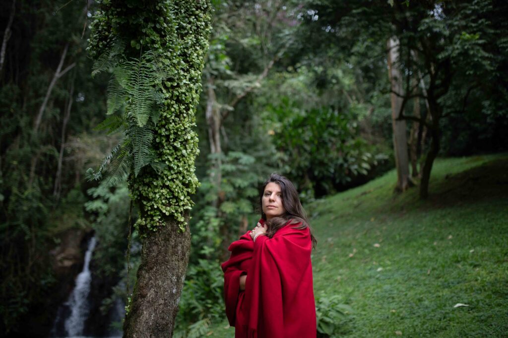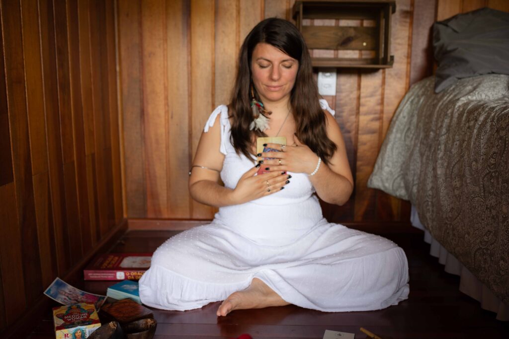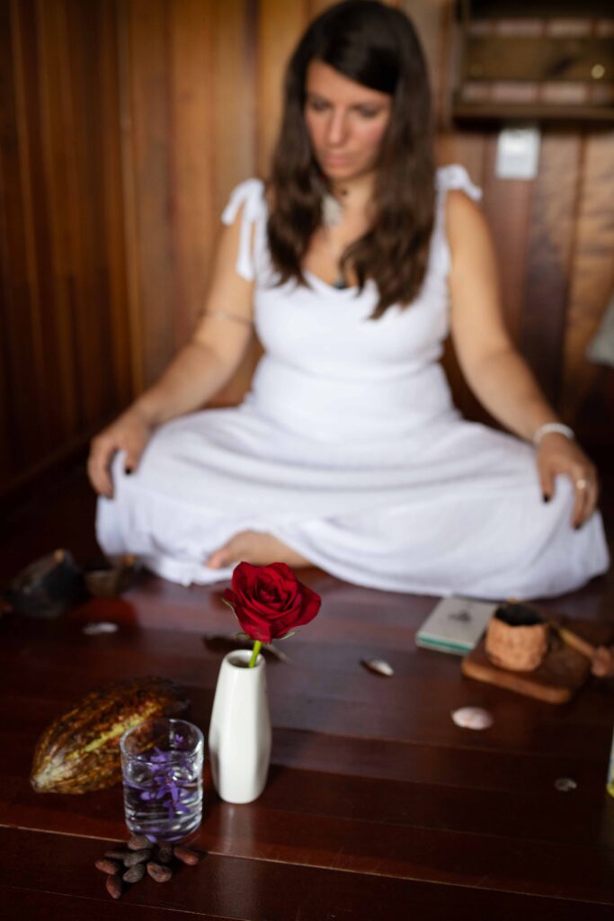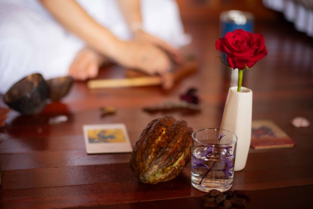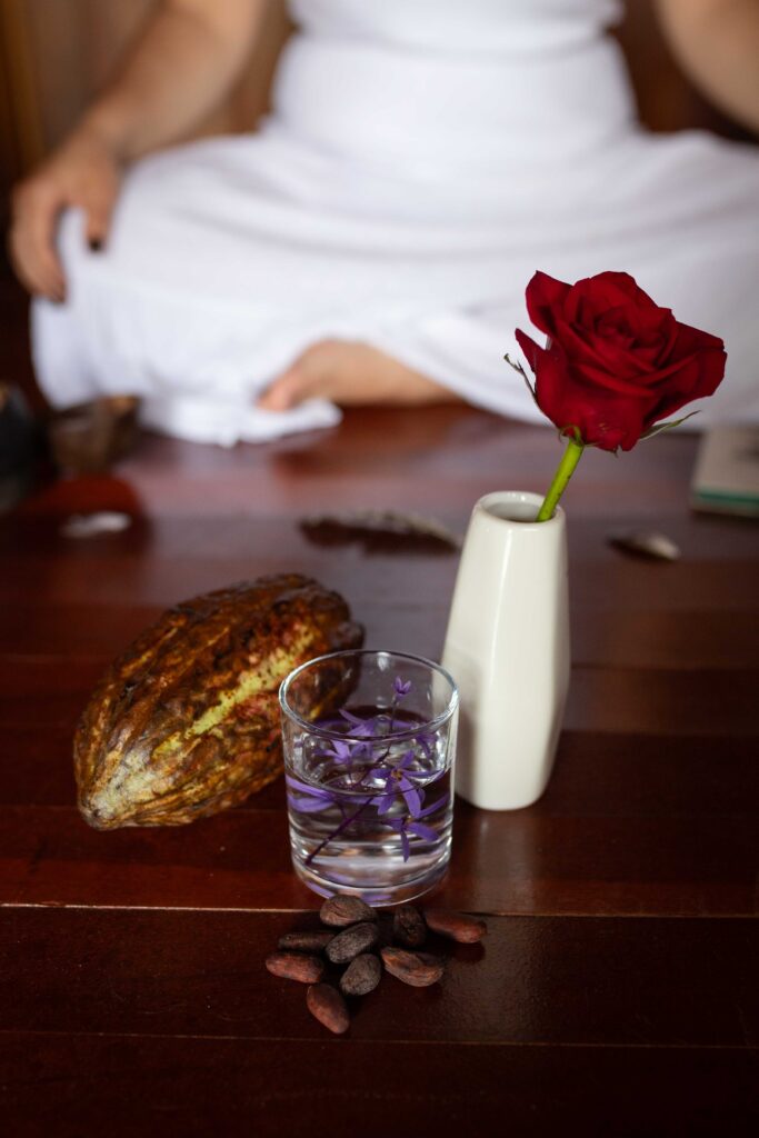A vivência da Retratoterapia começou no quarto da pousada onde Selina se hospedou — uma charmosa cabana de madeira no alto da montanha. Ali, montamos juntas um altar: objetos dela, alguns meus, e ao centro, um fruto de cacau encontrado de última hora, uma rosa vermelha em honra a Maria Madalena, e um copo de água com flores recém-colhidas no jardim. Tudo em perfeita harmonia com a paisagem das montanhas ao redor.