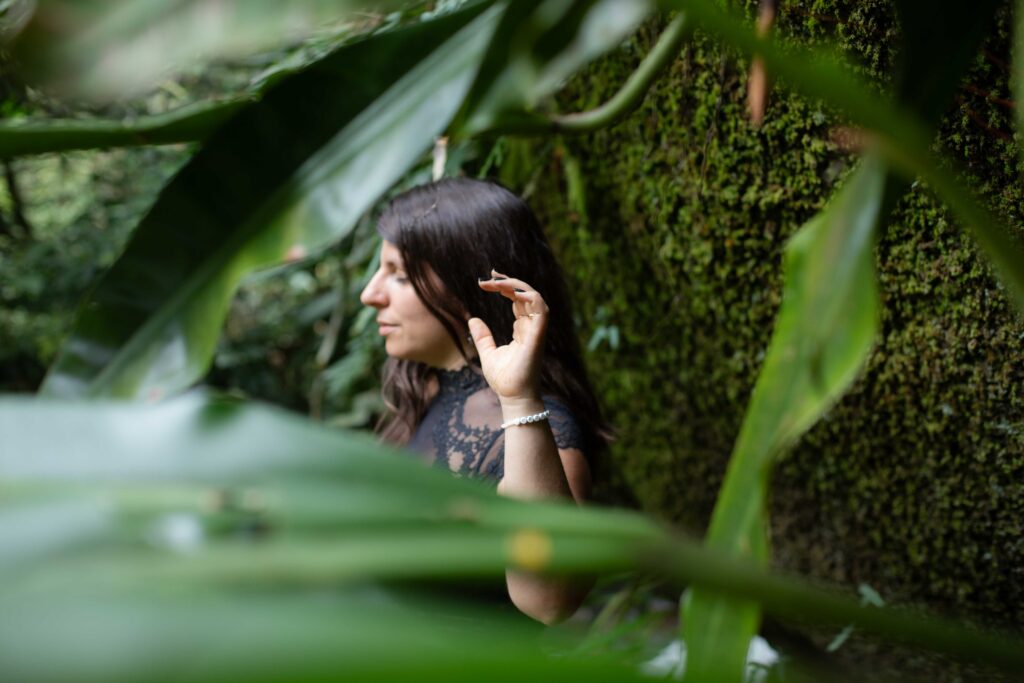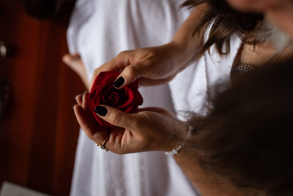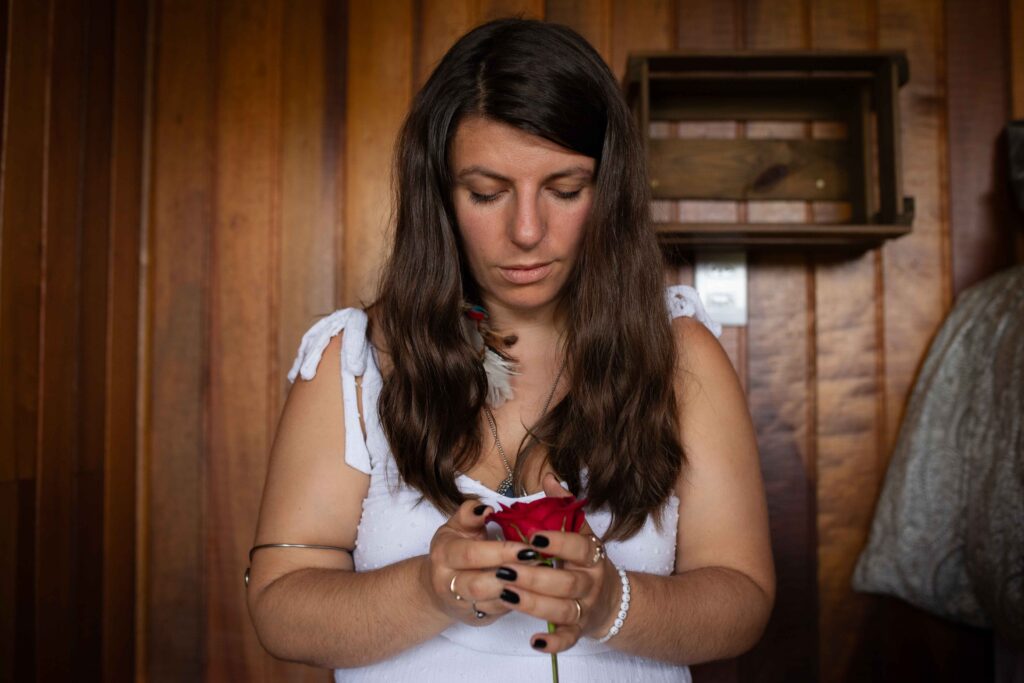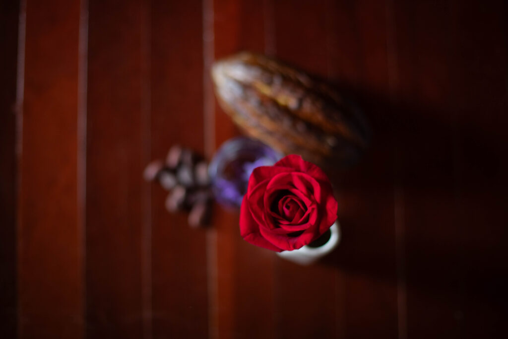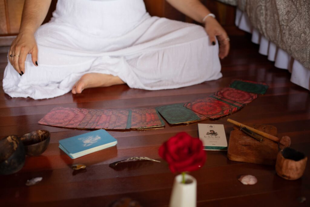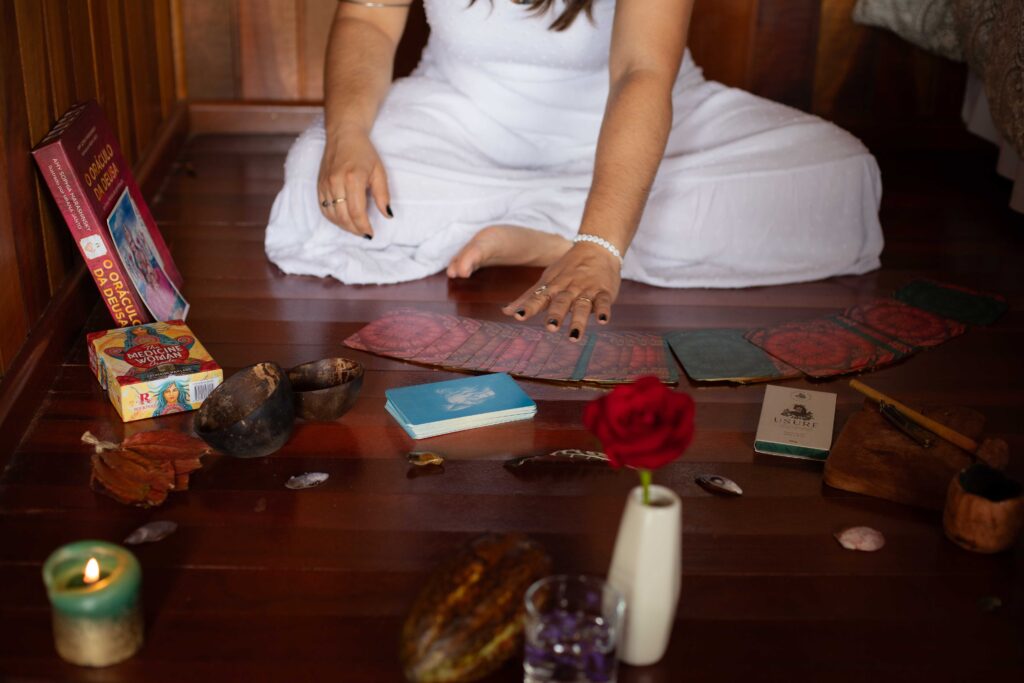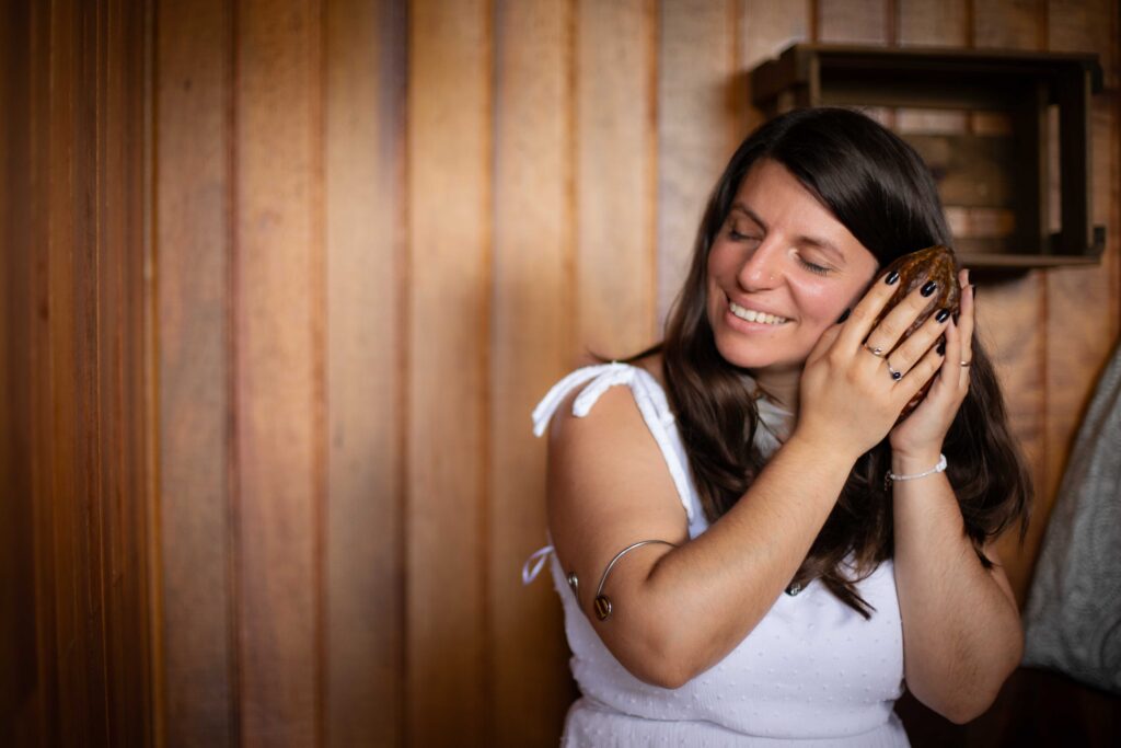 A vivência da Retratoterapia começou no quarto da pousada onde Selina se hospedou — uma charmosa cabana de madeira no alto da montanha. Ali, montamos juntas um altar: objetos dela, alguns meus, e ao centro, um fruto de cacau encontrado de última hora, uma rosa vermelha em honra a Maria Madalena, e um copo de água com flores recém-colhidas no jardim. Tudo em perfeita harmonia com a paisagem das montanhas ao redor.