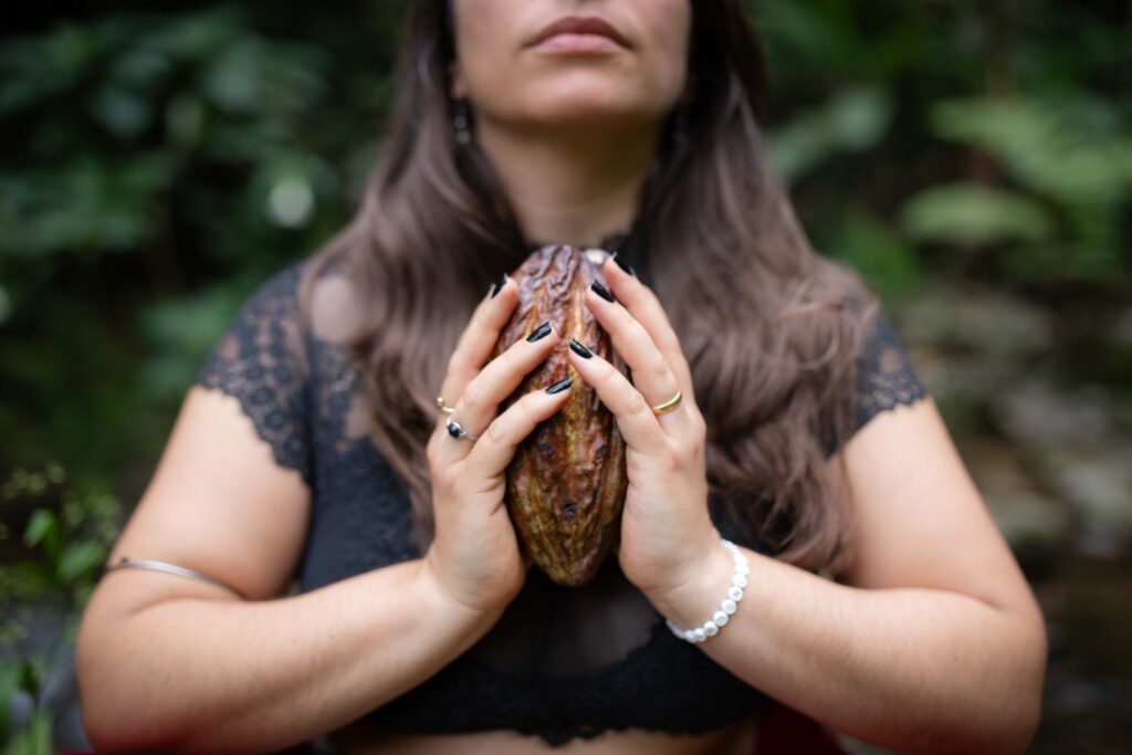 Mesmo à distância, um processo bonito se iniciou. A cada encontro, abrÃamos juntas um portal com a medicina do cacau, que a ajudava a se reconectar com o pulso da mulher selvagem que vive em seu ventre.